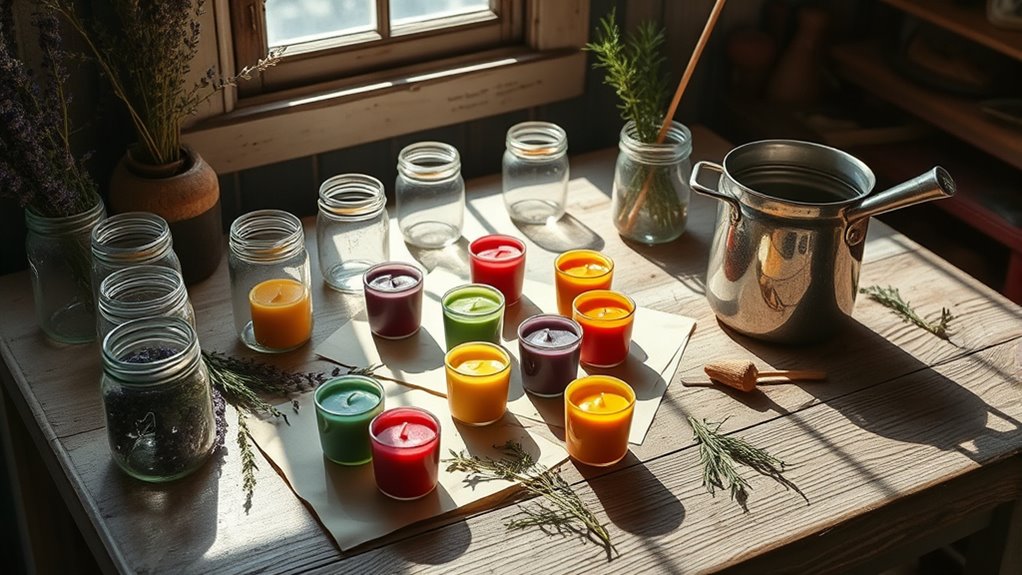 After mastering sustainable wick-making, you can enhance your candles further by infusing them with natural scents and colors. Essential oils are a cost-effective way to add delightful aromas without synthetic fragrances. Choose essential oils like lavender, citrus, or eucalyptus to create personalized scents that suit your mood. For colors, natural dyes derived from items like turmeric, beetroot, or spirulina work beautifully and are safe for the environment. To incorporate these, add a few drops of essential oils directly into the melted wax or mix natural dyes into the wax before pouring. This approach not only keeps your candles eco-friendly but also allows you to customize scents and colors effortlessly, making each candle uniquely yours while maintaining affordability. Incorporating essential oils for aromatherapy can further enhance your candle-making experience by providing additional health benefits and personalized aroma profiles. Utilizing natural dyes ensures your candles remain free from synthetic chemicals while allowing creative expression. Additionally, understanding the benefits of natural ingredients can help you select the best scents and colors for your eco-friendly candles. For optimal results, consider researching safe dyeing practices to prevent any unintended reactions during the coloring process.