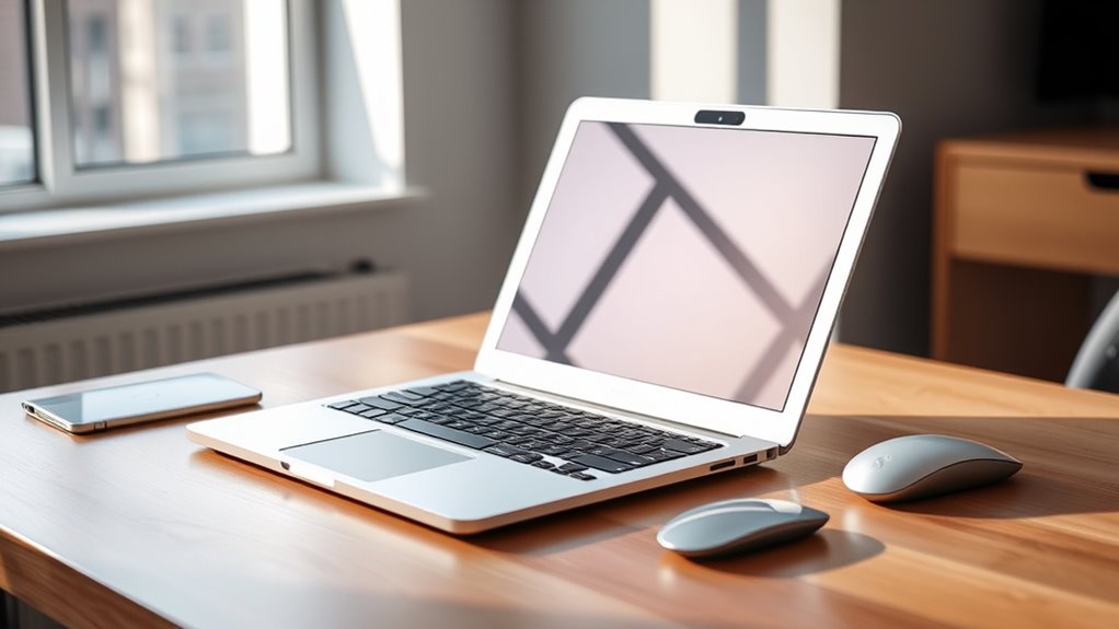 Portability is just one piece of choosing the right 2TB MacBook Air; compatibility within the Apple ecosystem plays a vital role in maximizing its value. I make sure my MacBook is compatible with my existing Apple devices to enable seamless integration. I verify that the macOS version supports the software and productivity tools I rely on across my devices. Features like Handoff, AirDrop, and Universal Clipboard are game-changers, allowing me to work smoothly across my Mac, iPhone, and iPad. I also check that my other devices support the latest connectivity standards, such as Wi-Fi 6E and Bluetooth 5.3, for ideal pairing. Finally, I consider the ecosystem’s privacy protections and security features, which safeguard my data across all connected Apple products.