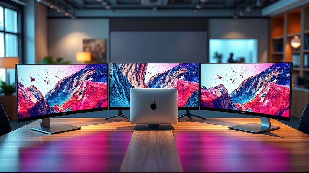 Stand adjustability features play a crucial role in creating a comfortable and ergonomic workspace, especially when working long hours on your MacBook Pro. Look for monitors with tilt, height, or swivel adjustments to customize your viewing angles. Height-adjustable stands help align the screen with your eye level, reducing neck strain and promoting better posture. Tilt adjustments allow you to find the ideal screen angle, minimizing glare and improving visibility. Additionally, VESA mount compatibility offers flexible mounting options, which is perfect for professional setups or space-constrained environments. Configurable stand options enable you to tailor the monitor’s position for maximum comfort and productivity. Prioritizing these features ensures that your workspace remains ergonomic, reducing fatigue and enhancing your overall working experience with your 5K monitor.