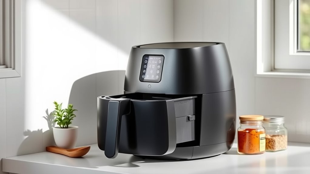 Choosing the right size and capacity is essential for small kitchens, where space is limited but functionality matters. Small air fryers typically range from 2 to 4 quarts, perfect for single servings or snacks without taking up too much counter or cabinet space. A compact model helps keep your kitchen uncluttered and easy to navigate. If you often cook for family or need larger portions, models with 5.8 quarts or more are available, but they require more storage. The capacity directly influences what you can cook at once, affecting meal variety and portion size. Balancing capacity with your available space guarantees your air fryer is both practical and efficient, making it a valuable addition without sacrificing valuable kitchen real estate.
