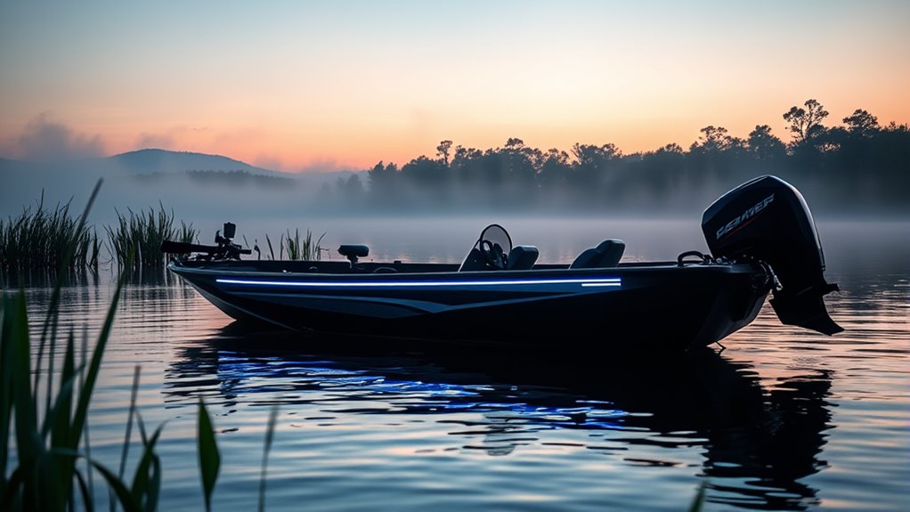 Night fishing demands reliable lighting features on a bait boat to guarantee clear visibility in low-light conditions. I look for boats equipped with LED night lights or other illumination options to help spot bait and navigate safely. Adjustable or multiple lighting modes are essential because different environments require different levels of brightness. A durable, waterproof lighting system is a must—nothing worse than lights failing during early morning or late-night sessions. I also prefer models with integrated searchlights or course lights to assist with navigation and bait placement in darkness. Ease of control is key, so I check if the lights can be activated quickly via remote or onboard switches. These features ensure I can fish confidently, regardless of the time or lighting conditions.