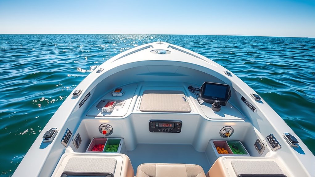 Selecting a bait boat that can handle challenging saltwater conditions means paying close attention to its buoyancy and stability. A high buoyancy rating guarantees the boat can support heavy loads and resist sinking in rough waters. Stability is equally important; a low center of gravity and a wide beam help prevent tipping during windy or choppy conditions. The materials used, such as reinforced plastics or corrosion-resistant metals, contribute to maintaining these qualities over time. Proper weight distribution and a balanced hull design keep the boat steady when carrying bait, gear, and electronics. Additionally, features like stabilizing fins or outriggers can further enhance stability in turbulent saltwater environments. Prioritizing buoyancy and stability ensures your bait boat remains reliable, safe, and effective in demanding conditions.