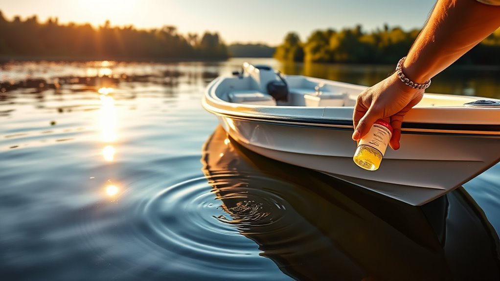 You’ll want a bait boat with safety features like automatic shut-off, low battery alerts, and secure remote controls to prevent accidents. I understand safety might seem like an extra hassle, but these features give me peace of mind and help avoid mishaps on the water. Look for sturdy construction, good visibility in low light, and easy-to-use controls. These guarantee you stay safe while enjoying your fishing adventure.