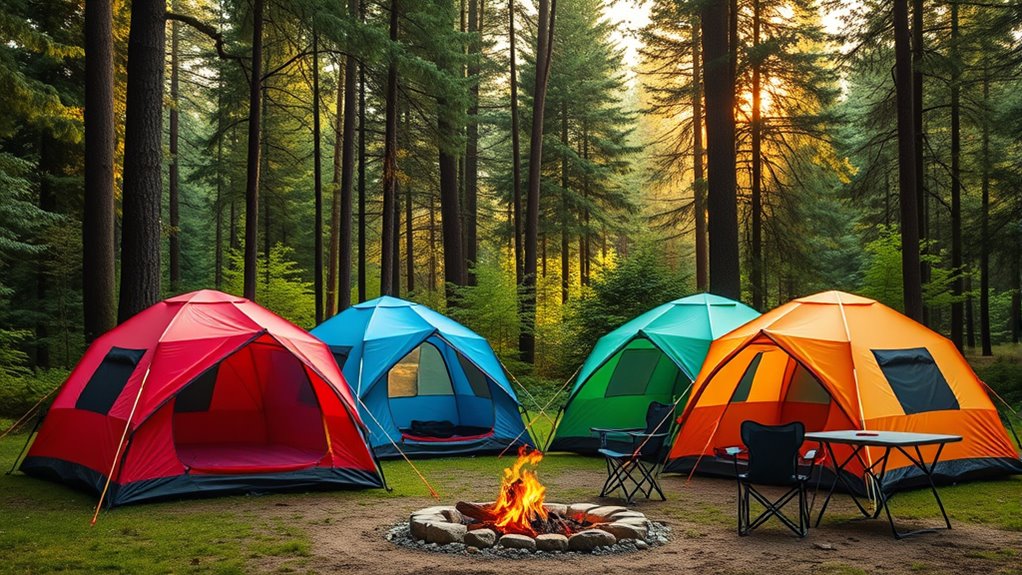 Durability is key when choosing a tent, like building a fortress that withstands storms. I’ve found that high-quality ripstop nylon and polyester with reinforced seams are top contenders for 2025. These materials resist tears and abrasions, ensuring your tent’s longevity. I always look for tents with sturdy poles and weather-resistant coatings, because investing in durable materials turns camping into a worry-free adventure, no matter the weather.