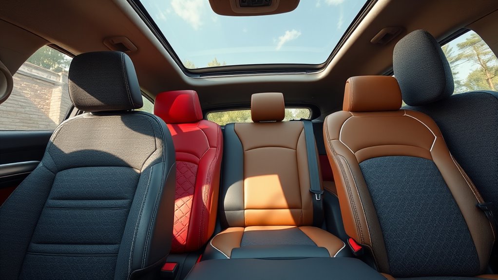 Choosing the right car seat cover means balancing durability with comfort, as both qualities substantially impact your driving experience. Durable covers are made from high-quality materials like genuine leather, polyester, or neoprene, which resist wear, tears, and fading over time. Comfort is enhanced with padding such as foam or memory foam, offering cushioning that reduces fatigue on long drives. Breathable fabrics like mesh or perforated leather improve air circulation, preventing heat buildup and ensuring you stay cool. Water-resistant or waterproof materials provide added protection against spills, stains, and moisture, preserving your seats’ condition. Additionally, an ergonomic design combined with high-resilience padding delivers support and pressure relief, making extended use more comfortable. Prioritizing these factors helps you find covers that last and feel great.