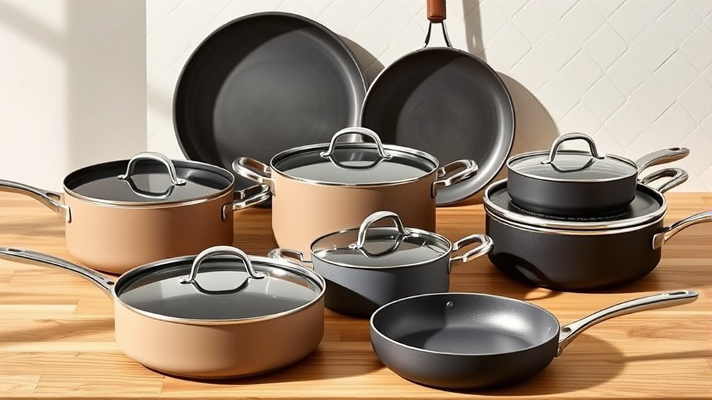 Choosing a safe Caraway cookware set starts with checking the materials used. I look for sets made from non-toxic, food-safe materials like ceramic, which are free from PTFE, PFOA, PFAS, lead, and cadmium. It’s essential that the non-stick coating is naturally derived and doesn’t contain harmful chemicals that could leach into my food. I also verify that the cookware complies with safety standards and holds certifications indicating it meets health and environmental regulations. Additionally, I confirm that the pieces are oven-safe up to around 550°F without safety concerns. Durability matters too—materials should resist chipping or degradation over time, preventing exposure to unsafe substances. These standards ensure I cook safely while enjoying long-lasting cookware.