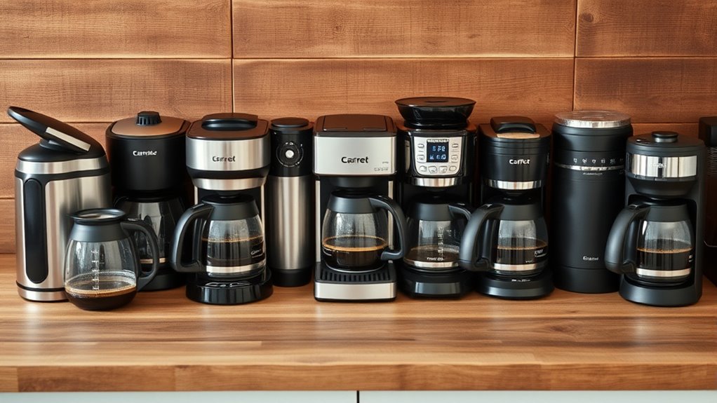Choosing a coffee maker under $100 isn’t just about size and design; it’s also about the features that make brewing more convenient and customizable. Built-in grinders let me enjoy fresh coffee without extra equipment, while programmable timers enable me to set brewing in advance for mornings. Brew strength controls give me flexibility to customize each cup, and unique options like cold brew or single-serve functions add versatility. Features like auto shutoff and keep-warm plates boost safety and keep my coffee fresh longer. Digital displays, LED timers, and touch controls make operation straightforward, even on a busy morning. Eco-friendly features, such as reusable filters and water level indicators, also add value. These features help me enjoy quality coffee without breaking the bank.