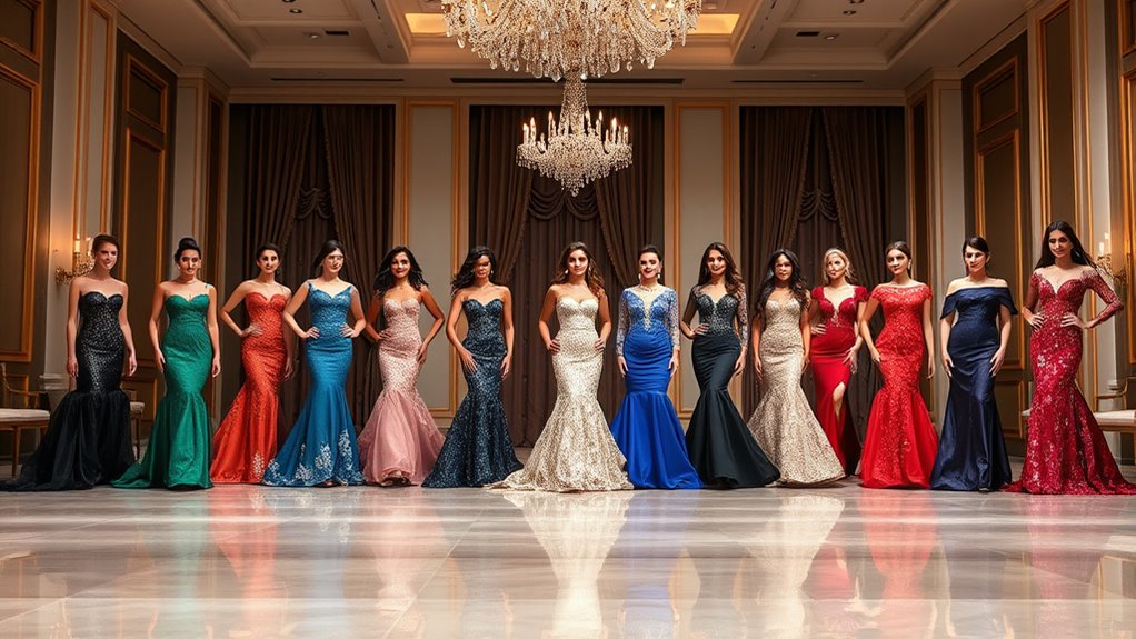 When selecting a designer evening gown, it’s crucial to take into account the formality of the event to guarantee your look is appropriate. For black-tie affairs, opt for a long, elegant gown that exudes sophistication, while semi-formal gatherings call for a chic cocktail dress. Always check the dress code on the invitation to ensure your gown’s style and embellishments align with expectations. Consider the season and venue—light fabrics like chiffon suit outdoor summer events, whereas luxurious velvet is perfect for winter galas. The gown’s features should match the event’s atmosphere; understated elegance works well for corporate functions, while glamorous details suit red carpet appearances. Ultimately, your gown’s color and silhouette should complement the theme, helping you look polished and appropriate.