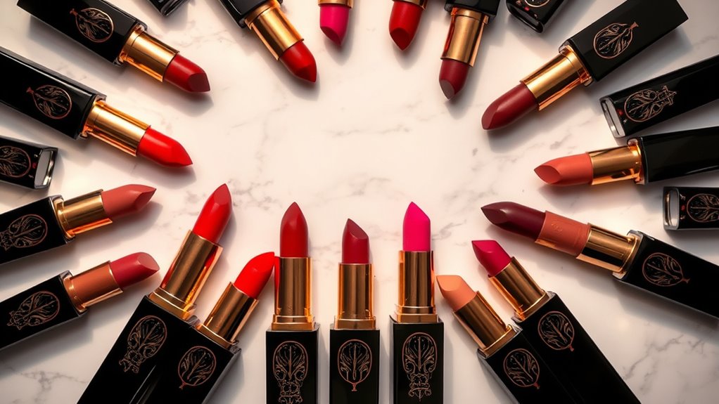 If you want to elevate your makeup game, I recommend exploring some of the best designer lipstick collections. From luxurious Italian Marble Sheer Lipstick and eco-friendly Hickey refillables to glamorous shades like Runway Rogue Pearl Glam and Paris Hilton gift sets, these collections combine style, quality, and longevity. With options featuring natural ingredients, bold colors, and sleek packaging, you’ll find something perfect for any look. Keep going to discover the top picks that can transform your lipstick routine seamlessly.