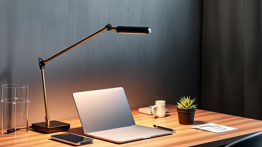 Adjustable light angles are key to customizing your workspace lighting. They let you direct illumination exactly where you need it, which helps reduce shadows and glare. Many desk lamps come with flexible goosenecks or multiple pivot points, allowing for multi-directional adjustments. This flexibility guarantees you can find the perfect angle for reading, writing, or working on your computer. Being able to change the light position also minimizes eye strain by preventing reflections and uneven lighting on your workspace. Some lamps support a wide range of motion, from 180° to 360°, giving you maximum control over your lighting setup. Properly adjusting the light angles not only improves visibility but also keeps you comfortable during long hours at your desk.