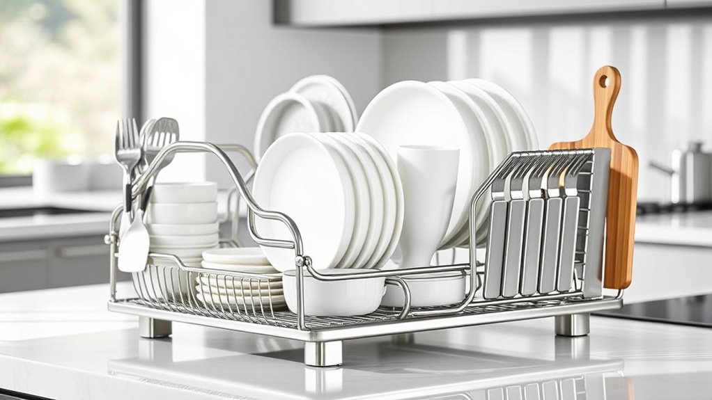 Selecting a durable dish drying rack means paying close attention to the materials used. I look for racks made from stainless steel, carbon steel, or high-quality plastic since they handle moisture and daily wear well. Stainless steel racks are my top choice because they resist rust and corrosion, making them perfect for humid kitchens. Coated metals, like powder-coated or chrome-finished steel, add extra protection against chipping and rust, extending their lifespan. When it comes to plastic racks, I prefer high-grade, water-resistant options to prevent warping, cracking, or mold growth over time. The durability of a rack depends on the quality of materials, construction, and how well it resists humidity, heat, and frequent washing. Choosing the right materials assures your rack stays functional and looks good for years.