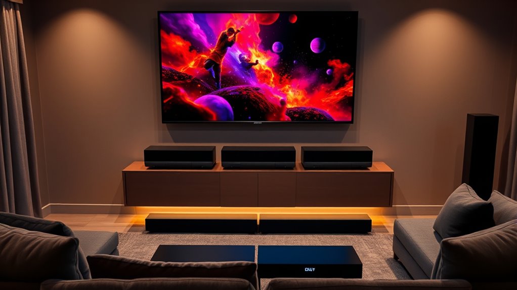 If you’re looking for the best Dolby Atmos soundbars under $500 for an immersive home theater experience in 2025, I’ve got you covered. These models, like the JBL Bar 500, Yamaha SR-B30A, and VIZIO 2.1 Soundbar, offer multi-channel sound, deep bass, and smart features without breaking the bank. Proper placement and your room acoustics are key to maximizing their effects. Keep going to discover detailed options and what makes each one stand out.