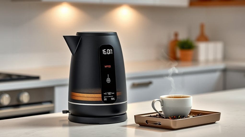 A crucial factor to contemplate when choosing an electric kettle is its temperature precision range, which determines how accurately you can set and maintain water temperature. This range usually falls within ±1°F to ±9°F, allowing for precise control. A narrower range means you can fine-tune the temperature more exactly, essential for brewing delicate teas or coffees that demand specific temperatures. Many kettles offer preset options, but the ability to manually adjust within a specific range adds flexibility. The typical control span from about 104°F (40°C) to 212°F (100°C) covers most brewing needs. Higher precision ensures ideal flavor extraction and aroma preservation, especially for white or green teas. Ultimately, a narrower precision range helps you achieve consistent, perfect results every time.
