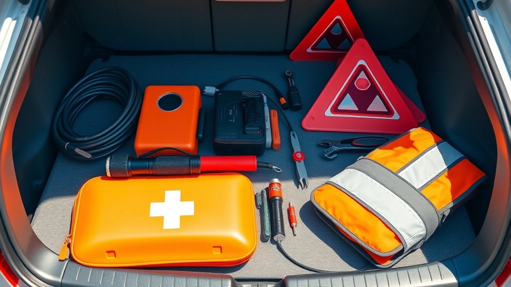 To guarantee you’re fully prepared for any roadside emergency, it’s vital to choose a kit that covers a broad range of situations. A comprehensive kit should address common issues like flat tires, dead batteries, and minor injuries, offering peace of mind on the road. Make sure it includes essential tools such as jumper cables, tire inflators, first aid supplies, warning triangles, and reflective vests. Also, consider your vehicle type and driving environment—if you frequently drive in winter or off-road areas, look for specialized items like snow shovels or multi-purpose tools. Redundancy is essential, so check if the kit has backup options for critical components. By evaluating these factors, you guarantee your kit provides reliable support when you need it most.