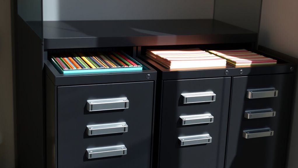 Choosing the right locking mechanism for your file cabinet is essential to guarantee your documents stay secure and easily accessible when needed. Key locks are the most common, requiring a physical key to lock and open drawers, providing straightforward security. Combination locks use a numeric dial or code, eliminating the need for keys but requiring memorization or written records of the code. Electronic locks offer advanced security options like keypad access, biometric identification, or remote control, blending convenience with security. Each type serves different needs: key locks are simple and reliable, combination locks are keyless but need careful code management, and electronic locks deliver high-tech security features. Your choice should depend on your security requirements, ease of use, and the environment where the cabinet will be located.