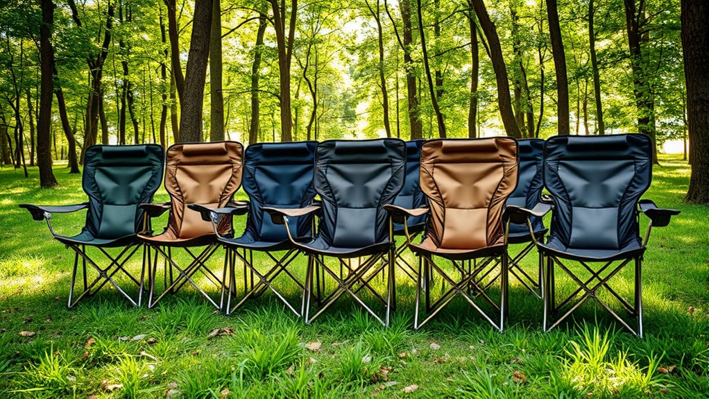 Comfort and support are essential when selecting a heavy-duty folding camp chair, especially for extended outdoor use. I look for models with padded high backrests and armrests to keep me comfortable during long hours. Ergonomic features like adjustable lumbar support and seat height help me customize the fit for better posture and reduced fatigue. I also pay attention to anti-sag mechanisms or elastic bottom bands, which prevent sinking over time and distribute weight evenly. Thick, high-density foam cushions add extra comfort, making long sits more bearable. Breathable fabrics like mesh panels or moisture-wicking materials such as 600D Oxford help keep me cool and dry. Prioritizing these features guarantees I stay comfortable and well-supported, no matter how long I’m outdoors.