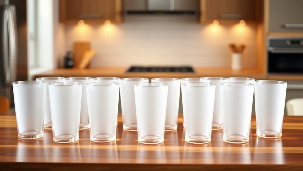 Ensuring that frosted glass tumblers consistently hold 12 ounces is essential for enjoying your beverages without surprises. I always verify that the height and width measurements are uniform across multiple units to ensure consistency. Checking the product specifications for precise volume measurements helps avoid discrepancies in capacity. Keep in mind that manufacturing tolerances can cause slight size variations, usually within 5% of the stated volume, so minor differences are normal. It’s also important to confirm that the frosted coating doesn’t affect the internal volume, guaranteeing that the capacity remains consistent regardless of surface finish. By paying attention to these factors, you can confidently select tumblers that deliver a reliable, enjoyable drinking experience every time.