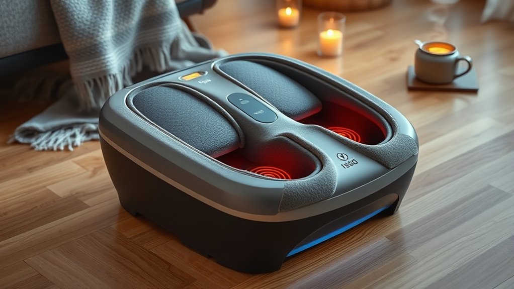 Choosing the right heated foot massager depends heavily on the massage techniques it offers, as each provides unique relaxation benefits. For example, shiatsu uses finger pressure on reflex zones to boost circulation and relieve tension, making it ideal for targeted relief. Kneading and rolling mimic manual massage, helping to soothe sore muscles and improve blood flow across the foot. Tapping and percussion stimulate nerve endings with rhythmic taps, promoting overall relaxation. Air compression techniques offer adjustable pressure levels that enhance circulation and reduce swelling, working well alongside other methods. When selecting a massager, consider which techniques resonate most with your needs—whether you want deep muscle relief, nerve stimulation, or gentle circulation boost. The right combination can elevate your home spa experience to new heights.