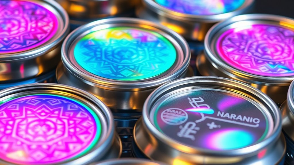 Choosing the right heat-resistant holographic labels requires selecting materials that can endure high temperatures without warping or fading, ensuring your branding stays intact even in hot environments. I look for labels made from durable, multi-layer or composite materials that offer enhanced thermal stability. The coatings should resist thermal degradation, maintaining their vibrant visual effects after prolonged heat exposure. I also pay attention to the adhesive, which needs to stay strong and bond reliably even when temperatures rise. To confirm reliability, I rely on testing standards that expose labels to specific heat ranges and durations. This way, I can be confident that the labels won’t peel, delaminate, or degrade, ensuring they perform consistently in demanding, high-temperature conditions.