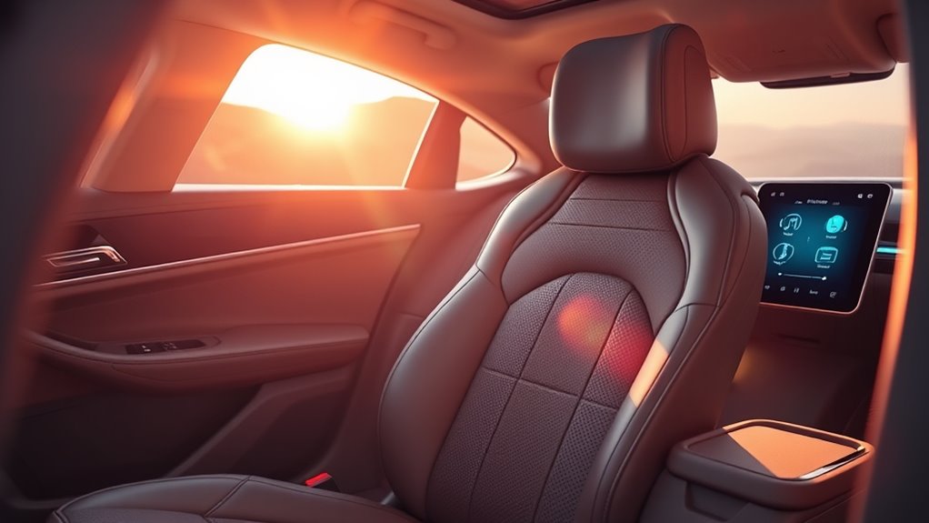High-end car seat massagers often come equipped with adjustable heat and cooling features that considerably boost comfort during long drives. These models typically include customizable heat settings, allowing me to choose soothing warmth or cooling to match my needs. Many offer dual-zone heating, so I can target specific areas like my lower back or seat for personalized relief. Cooling functions, often activated by built-in fans or air circulation systems, help prevent sweating and keep me comfortable on extended trips. The combination of heat and cooling not only enhances relaxation but also promotes better blood flow, reduces muscle tension, and prevents discomfort from sitting too long. Safety features like automatic shut-off and overheat protection ensure I can enjoy these functions safely during extended use.