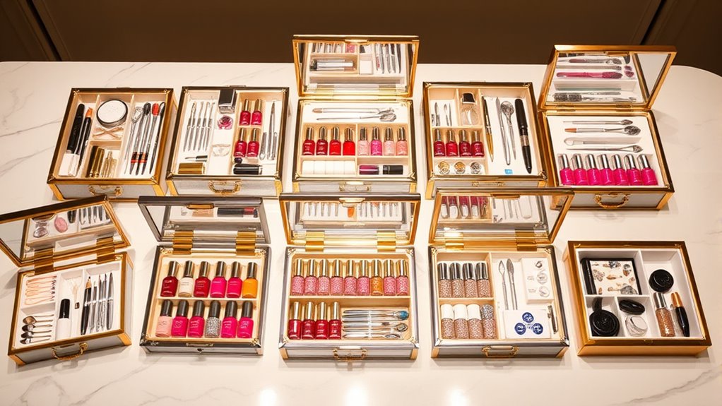 A high-end nail care kit isn’t complete without a case that’s built to last and protect your tools. I look for cases made from genuine leather or sturdy synthetic materials that withstand daily wear. Proper interior organization with fixed slots or elastic bands keeps tools secure and prevents shifting, reducing damage risk during transport. Reinforced edges and secure closures like zippers or snap buttons boost durability and shield tools from impacts. I also prefer compact, ergonomic designs that are easy to handle and portable—perfect for travel or daily use. Stylish finishes and additional protective layers add to the case’s resilience while enhancing its aesthetic appeal. Ultimately, a well-designed, durable case ensures my tools stay safe, organized, and ready whenever I need them.