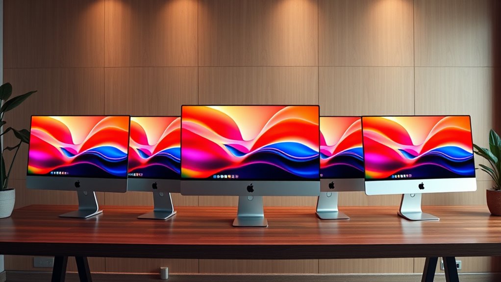 A high-performance iMac needs a display that keeps up with demanding tasks and creative workflows. A larger size, like 24 inches, offers more workspace, making multitasking and complex projects easier. The resolution, such as 4.5K Retina, guarantees sharp, detailed visuals essential for editing and design. Support for up to 1 billion colors boosts color accuracy and vibrancy, crucial for creative professionals. Brightness levels around 500 nits improve visibility and contrast in various lighting conditions, reducing eye strain during long hours. An immersive display with high pixel density provides a smooth viewing experience, minimizing fatigue. Choosing the right display size and quality ensures your iMac meets your productivity needs while delivering outstanding visuals for creative work.