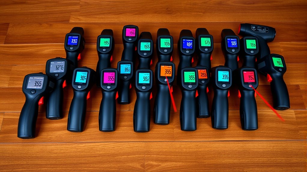 Selecting an infrared laser thermometer with precise laser targeting is crucial for accurate temperature measurements. Dual laser pointers improve targeting accuracy by clearly indicating the measurement area, reducing errors caused by misaiming. A smaller spot size allows for pinpoint accuracy on specific surfaces, especially in detailed or tight spaces. The distance-to-spot ratio plays a critical role; a higher ratio means you can measure from a greater distance while maintaining precision. Proper laser alignment ensures you’re targeting the correct surface, preventing stray beams or misdirected readings. Clear, well-defined laser targeting is especially essential when measuring small or intricate objects. Overall, choosing a thermometer with high laser targeting precision ensures you get reliable, consistent results, making it a key factor in selecting the right device for your needs.