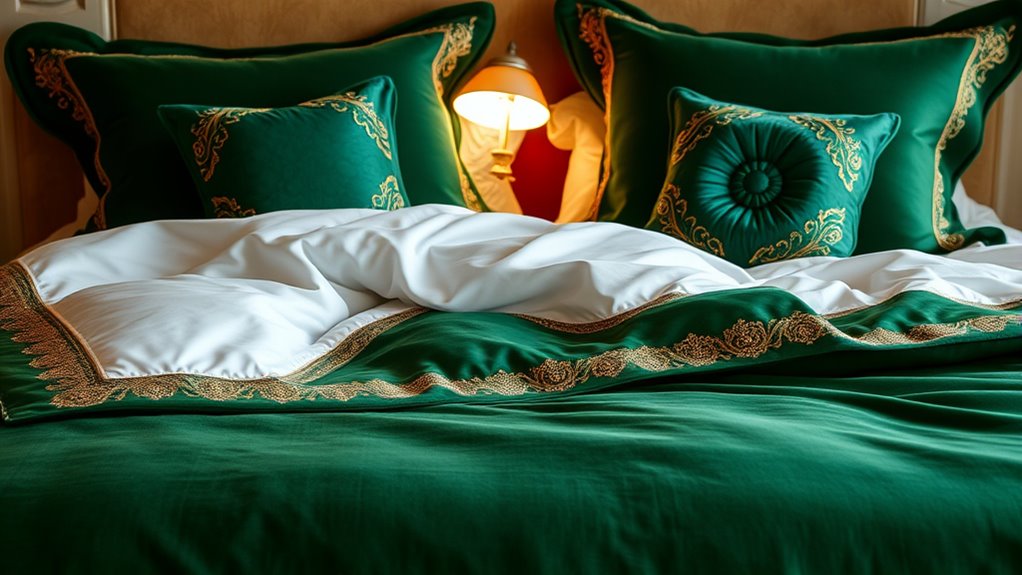Choosing luxury bedding sets that adapt seamlessly to changing seasons requires careful attention to the materials and design features. I look for breathable fabrics like cotton, linen, or microfiber, which help regulate temperature and keep me comfortable year-round. Multi-layered or reversible options are a game-changer, as I can easily adjust them for warmth in winter or coolness in summer. Bedding with insulating fillings such as down-alternative or wool offers cozy warmth without overheating. Moisture-wicking fabrics keep me dry during warmer months, enhancing comfort. Additionally, I consider the construction and fabric quality, ensuring they withstand frequent washing and temperature shifts without shrinking or fading. Prioritizing these features helps me enjoy a versatile, comfortable bed no matter the season.