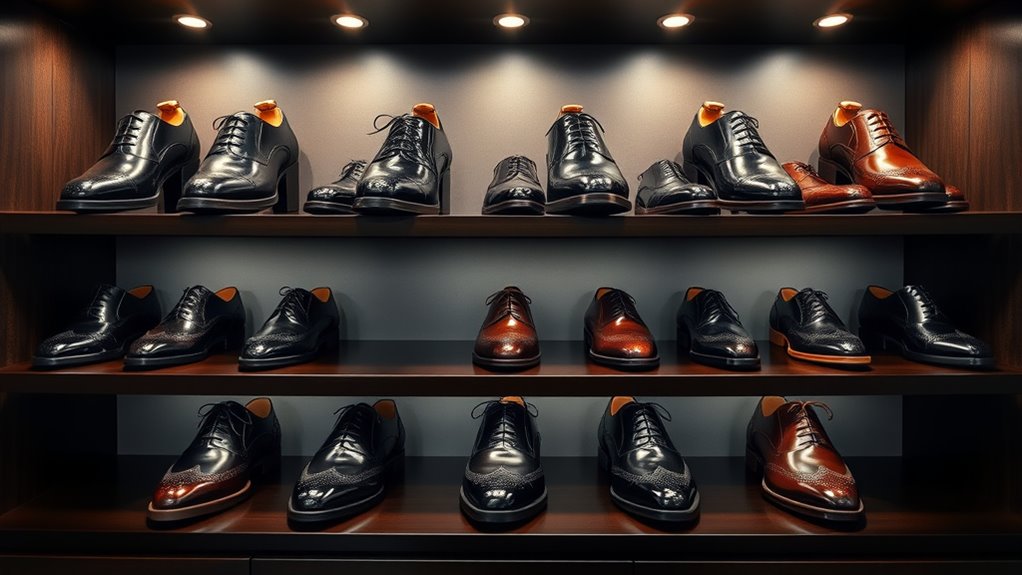To properly care for my luxury men’s dress shoes, I regularly clean and polish them to keep the leather looking sharp. I use a soft brush to remove dirt and a quality conditioner to prevent cracking. I always store them in a dust bag or box and rotate wearing them to avoid unnecessary wear. These simple steps help me maintain their elegance and guarantee they last for years.