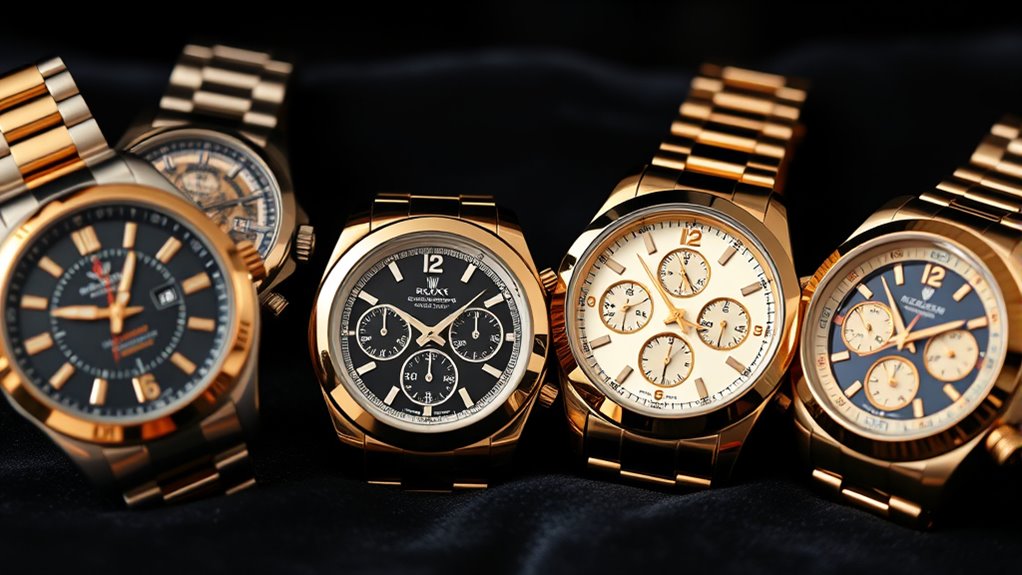 Ever wondered why some luxury watches instantly catch your eye? It’s often their brand reputation and prestige that draw attention. A well-known brand like Rolex, Omega, or TAG Heuer signals high-quality craftsmanship and exclusivity, boosting the watch’s perceived value. These brands have a rich history of innovation and tradition, adding to their allure. Additionally, a strong reputation can markedly influence resale value—established brands tend to hold their worth better over time. Certifications and awards further demonstrate a brand’s commitment to excellence, building trust. When you buy from a reputable brand, you also gain assurance of authenticity, access to authorized service centers, and peace of mind that your investment will last. Brand prestige isn’t just about status—it’s about quality, trust, and long-term value.