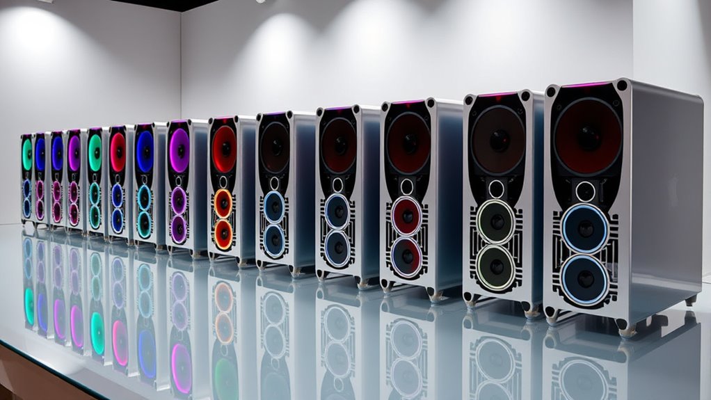 To guarantee smooth workflows in 3D rendering and simulation, a Mac Pro’s connectivity features must support high-speed data transfer and versatile device integration. I look for multiple Thunderbolt 4 or Thunderbolt 5 ports to handle fast data transfers and connect external drives, GPUs, and peripherals seamlessly. HDMI ports and SDXC card slots are essential for quick media and data workflows, whether importing assets or delivering outputs. Reliable networking options like Gigabit Ethernet or higher speeds ensure rapid data sharing and remote collaboration. Supporting multiple external displays, such as dual 6K or 8K monitors, allows for expansive workspace visualization critical for complex projects. Additionally, high-impedance headphone jacks and audio input/output options facilitate immersive audio monitoring and integration, streamlining the entire creative process.