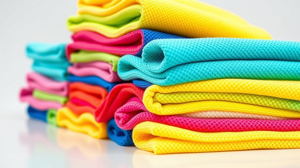 Choosing the right microfiber cleaning cloth depends heavily on its material quality and thickness, as these factors directly influence durability, absorbency, and cleaning performance. Higher GSM cloths, like 300 GSM, tend to be more durable and absorbent, making them excellent for tough cleaning tasks. Thicker fabrics, such as those with a 2.5mm pile, trap more dirt, dust, and liquids, boosting efficiency. Material quality also matters; blends of polyester and polyamide affect softness, lint-free use, and scratch resistance. Premium cloths often feature reinforced stitching and overlock edges, reducing fraying and fiber shedding over time. When selecting a microfiber cloth, opt for high-quality materials and appropriate thickness to guarantee it stays effective and reusable through many washes, providing the best cleaning results.