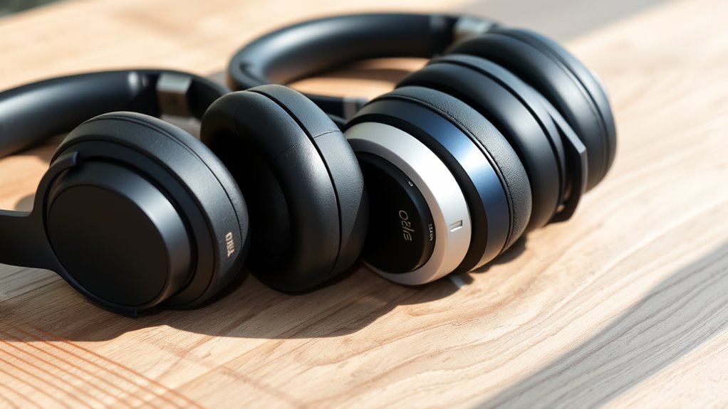 Ever wondered how comfort and fit can make or break your experience with noise-canceling headphones? It’s *essential* to choose models with adjustable headbands and soft ear cushions, like memory foam or protein leather, for a personalized fit. Ergonomic designs with pressure-relief features and lightweight materials—ideally under 10 ounces—help prevent fatigue during long listening sessions. Over-ear models with cushioned cups that conform to different head and ear shapes offer a secure, comfortable seal for effective noise cancellation. Foldable or collapsible features make storage and transport easy without sacrificing comfort. Additionally, breathable, skin-friendly padding minimizes heat buildup, ensuring you stay comfortable even during extended use. Prioritizing these factors guarantees a more enjoyable, fatigue-free listening experience.