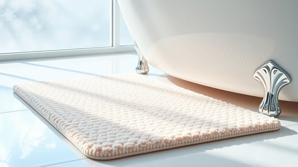 Suction power plays a vital role in keeping a bath mat securely in place on wet surfaces. The effectiveness of this suction depends on the number, size, and quality of the suction cups. More suction cups generally mean better grip, but their size matters too—larger cups create a stronger seal. High-quality suction cups are made from durable, flexible materials that adhere better to smooth surfaces like tiles or acrylic tubs. It’s imperative to choose a mat with well-designed, sturdy suction cups to prevent slipping. Also, verify the surface is clean before placing the mat, as dirt or soap residue can weaken suction. Overall, paying attention to the number and quality of suction cups helps guarantee your bath mat stays securely in place, keeping you safe.