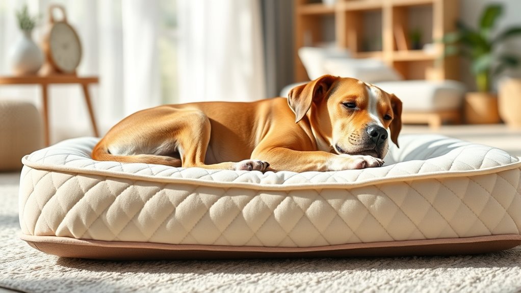 Selecting the right supportive materials is essential for ensuring your pet’s comfort and joint health. High-density egg crate foam provides consistent support and pressure relief, which is critical for pets with joint issues. Look for foam with CertiPUR-US certification, as it guarantees the material is free from harmful chemicals, making it safer and more durable. Memory foam or gel-infused foam molds to your pet’s body, offering targeted orthopedic support and reducing pressure points. Additionally, waterproof and tear-resistant layers help the mattress maintain its shape and support over time, even with regular use. The fabric covering should be skin-friendly, breathable, and easy to clean, ensuring your pet stays comfortable, hygienic, and free from irritation. Prioritizing quality supportive materials is essential for long-term comfort and health.
