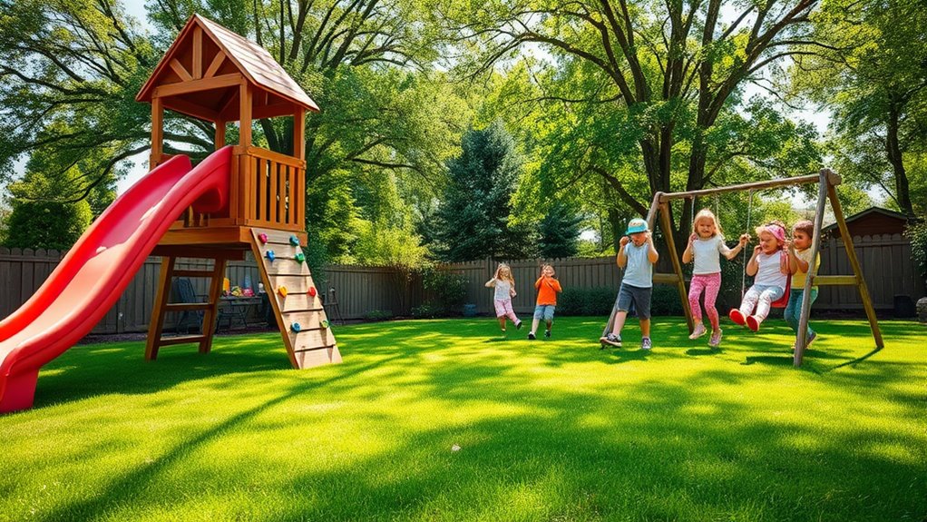 Ensuring your outdoor playset fits well in your backyard requires careful measurement and planning. First, measure the available space to confirm the playset won’t overcrowd the area or block walkways. Remember to include safety clearance zones around slides, swings, and climbing sections—these are essential for safe play. Take note of nearby structures, trees, or fences that could interfere or pose safety risks when kids are active. Also, consider the vertical space needed for taller components like towers or slides, making sure there’s enough headroom. Finally, leave open space around the equipment so children can run, jump, and play freely without restrictions. Proper planning ensures your backyard remains safe, functional, and fun for everyone.