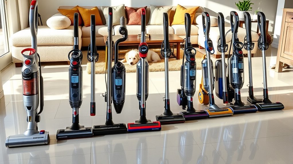 Selecting the right pet hair removal tools can make a significant difference in cleaning efficiency and ease. Self-cleaning brush rolls automatically dislodge hair, reducing tangles and maintenance, making cleanup faster. Specialized pet tools like crevice tools and upholstery brushes are designed to target tricky areas such as furniture, stairs, and tight spots, ensuring thorough removal. Turbo brushes and pet power brushes are optimized for lifting hair from carpets and upholstery, enhancing overall performance. When paired with HEPA filters, these tools also help trap airborne allergens and pet dander, improving indoor air quality during cleaning. Choosing vacuums with a variety of attachments ensures you can effectively tackle pet hair on multiple surfaces, making your cleaning routine more efficient and less frustrating.