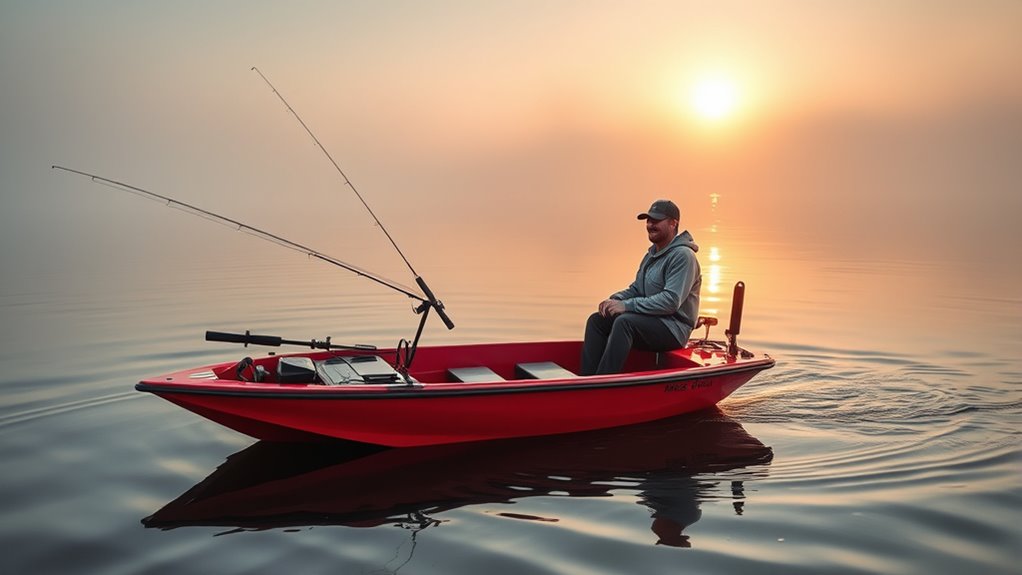 Adding the right accessories to my portable fishing bait boat can make a big difference in how smoothly my trips go. GPS remote controls let me navigate easily and stay on course, especially in unfamiliar waters. Spare batteries ensure I don’t run out of power during long outings, giving me peace of mind. Bait deployment systems and bait release mechanisms help me keep bait lively and make casting more efficient. Water refilling systems simplify maintaining bait freshness, while LED lights and night fishing features improve visibility when the sun sets. Organizing gear with tackle boxes and bait containers keeps everything accessible. Compatibility with various batteries and power options also guarantees extended operation in remote spots. These accessories truly enhance my fishing experience, making trips more productive and enjoyable.