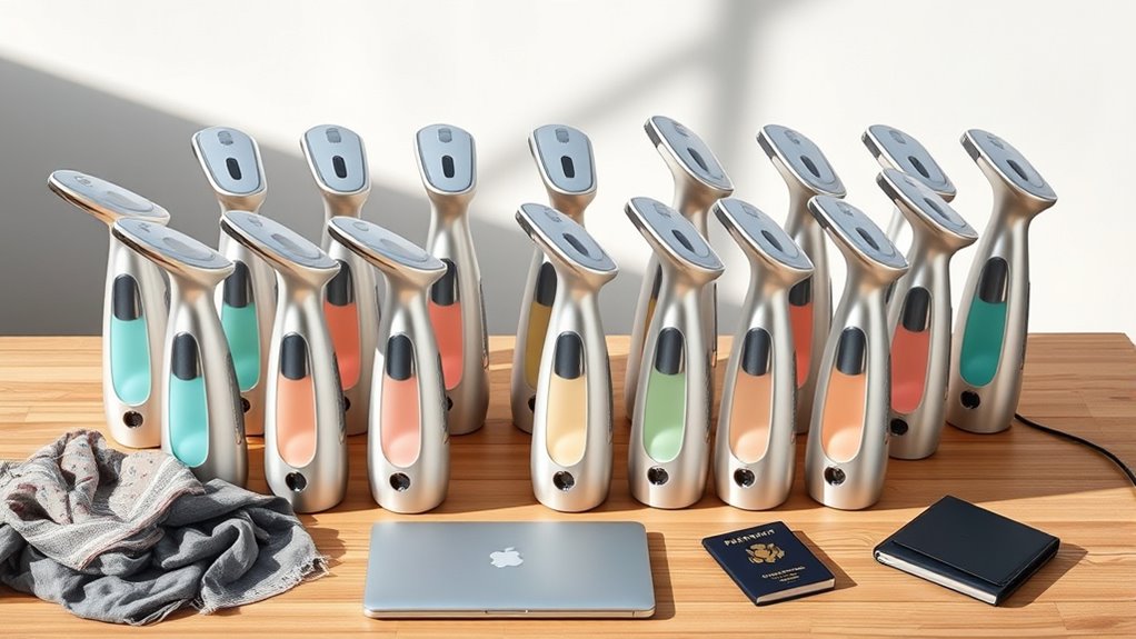 Like a knight’s armor, these steamers are gentle yet effective on delicate fabrics. I’ve used them on silk and chiffon, and they smooth wrinkles without damaging fibers. The low heat settings and precision steam vents give me confidence that my fragile clothes stay intact. They perform beautifully, making travel touch-ups effortless. Honestly, I’d trust these to handle even my most delicate pieces with care, just like a trusted squire.