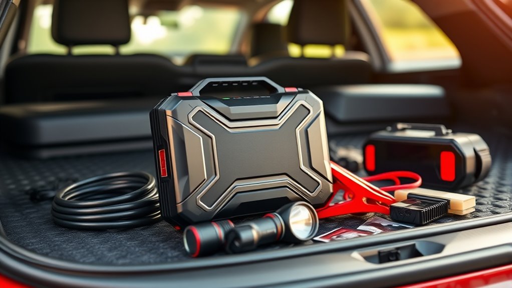 Many portable jump starters go beyond just providing a jump-start; they include a variety of emergency tools that can be lifesavers in roadside situations. For example, built-in LED flashlights with SOS and strobe modes are invaluable for signaling or illuminating your surroundings at night. Some models feature integrated air compressors or tire inflators, allowing quick tire repairs or inflation without extra equipment. Many also offer additional USB ports and power banks, so you can keep your phone or tablet charged during emergencies. Safety features like overcharge, over-discharge, overcurrent, and reverse polarity protections guarantee safe operation. Accessories such as smart jumper cables, carrying cases, and multi-function tools further boost your preparedness, making these jump starters versatile and reliable in various roadside scenarios.