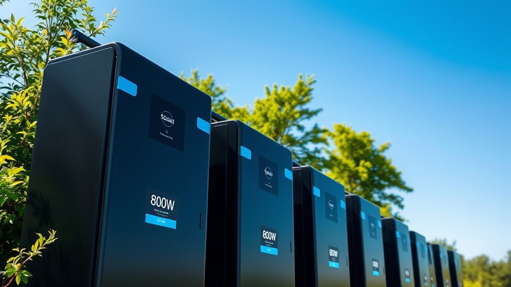 When choosing a power station with solar input 800W, portability and design are essential factors that can make or break your experience. A lightweight, compact design makes it easier to carry during outdoor adventures or emergencies. Ergonomic handles and foldable features further enhance ease of transport, allowing quick setup and pack-up. A durable, rugged exterior guarantees the unit can withstand rough handling and environmental conditions. Small form factors with integrated carrying options, like built-in wheels or streamlined shapes, help reduce weight and improve maneuverability. These design elements not only make transportation more manageable but also ensure the power station stays protected and functional in various settings. Ultimately, a thoughtful design enhances convenience and reliability during your off-grid adventures.