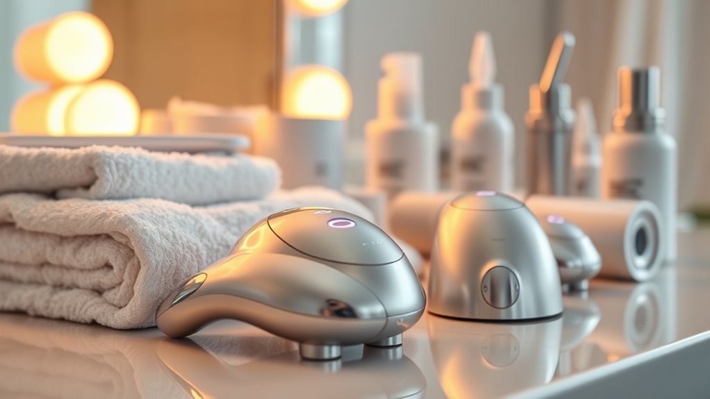 I’ve explored the top premium anti-aging facial devices that combine advanced light therapy, micro-current, heat, and massage to give spa-quality results at home. These gadgets feature multiple LED light modes, ergonomic designs, and customizable settings to tighten skin, reduce wrinkles, and boost collagen. They’re portable, user-friendly, and made with skin-safe materials. If you want to find out which models stand out and how they work, just keep going—there’s a lot to discover.