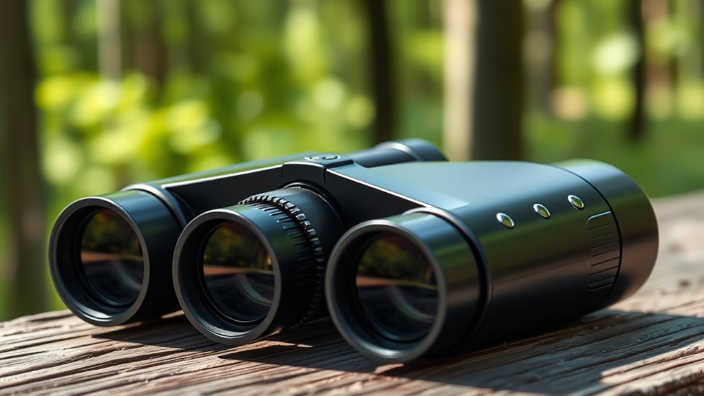 High-quality binoculars almost always feature fully multi-coated lenses, which are vital for maximizing light transmission and minimizing glare. These coatings ensure brighter, sharper images with better contrast, essential when spotting small or distant birds. Advanced coatings like dielectric or phase coating further enhance contrast and color fidelity, revealing intricate feather details. Multiple layers of anti-reflective coating on both the objective and eyepiece lenses considerably improve low-light performance, such as dawn or dusk birding. Lens coatings also prevent internal reflections and ghosting, resulting in a more natural, vivid viewing experience. The quality and type of coating directly impact image brightness, sharpness, and overall clarity. When choosing premium binoculars, prioritizing superior lens coating quality guarantees a clearer, more detailed view, elevating your bird-watching experience.