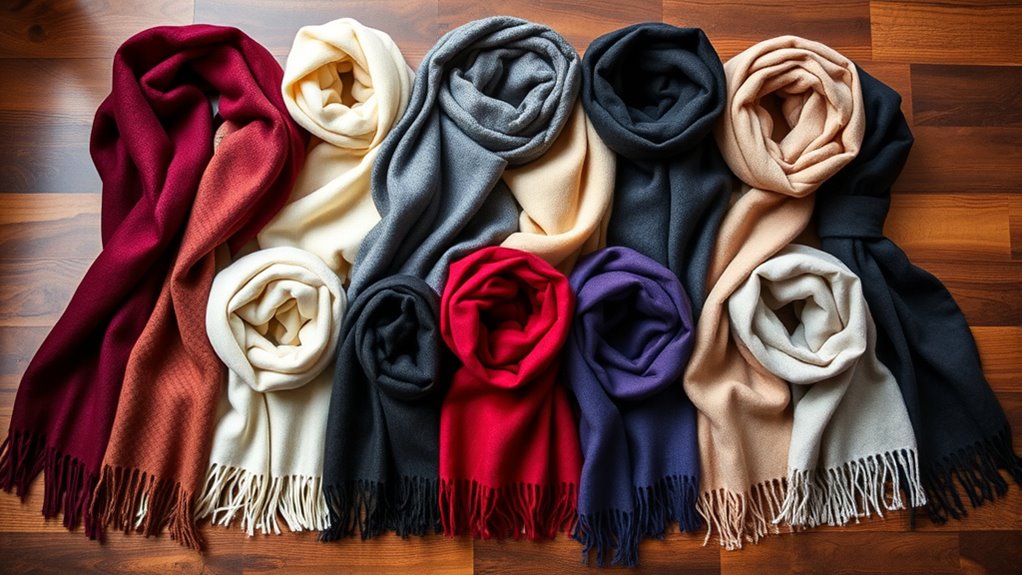 Selecting the right size and fit for a premium cashmere scarf is essential to achieving both comfort and style. Scarves come in various sizes, from narrow wraps to oversized shawls, allowing you to choose based on your preferred look and purpose. Lengths typically range from around 60 inches for standard styles to over 80 inches for extra-long options, giving flexibility in wrapping and knotting. Widths vary from approximately 10 inches for slim scarves to 30 inches or more for larger wraps, offering different levels of coverage. Your choice depends on whether you want a lightweight neck accessory or a substantial wrap. Having multiple size options guarantees you can personalize your style for different occasions, balancing comfort and elegance effortlessly.