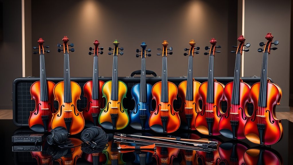 If you’re searching for the 12 best premium electric violin starter kits for 2025, I can help you find options that blend top-tier craftsmanship, high-quality materials, and versatile features. These kits offer excellent sound, durability, and comfort, making them perfect for aspiring musicians. From complete setups with accessories to stylish designs, there’s something for everyone. Keep exploring, and you’ll discover detailed insights to choose the perfect electric violin kit for your journey.