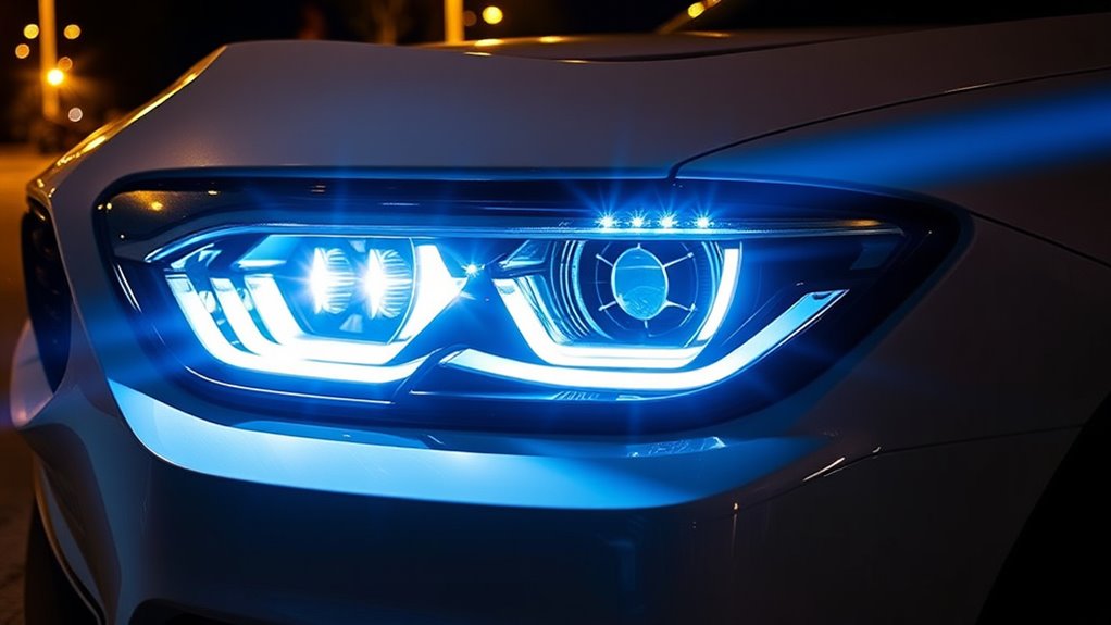 A well-designed beam pattern is essential for maximizing the effectiveness of your LED headlights while minimizing glare for other drivers. It ensures the light is focused where you need it, enhancing visibility without blinding oncoming traffic. A sharp cut-off line prevents light from spilling into adjacent lanes, maintaining safety for everyone on the road. Precise beam focus allows for better long-distance illumination, giving you more reaction time in critical situations. Uniform light distribution helps eliminate dark spots and shadows, providing consistent visibility across the entire road. Advanced LED upgrades use optical lenses and reflector technology to achieve these sharp, well-defined patterns. Ultimately, a carefully engineered beam pattern not only boosts your driving confidence but also keeps the road safer for all.
