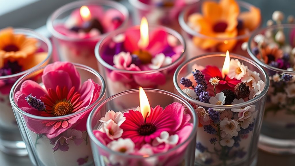Press-dried flower candles can be safe for children and pets if you take proper precautions. I always guarantee they’re placed out of reach to prevent accidental knocks or ingestion. Additionally, I use high-quality, non-toxic wax and fragrance oils. Never leave them unattended while burning, and trim the wick regularly. With these safety measures, you can enjoy their beauty without worry.