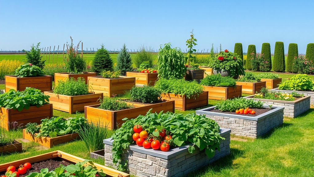 If you’re looking for the 15 best raised garden beds for a thriving garden in 2025, I recommend considering options made from durable galvanized steel, weather-resistant wood, or eco-friendly materials like VZ 2.0 steel. Features like reinforced corners, open bottoms for drainage, and ergonomic heights can make gardening easier and more successful. To choose the right fit for your space and needs, check out the detailed options—more helpful insights await as we explore each one.