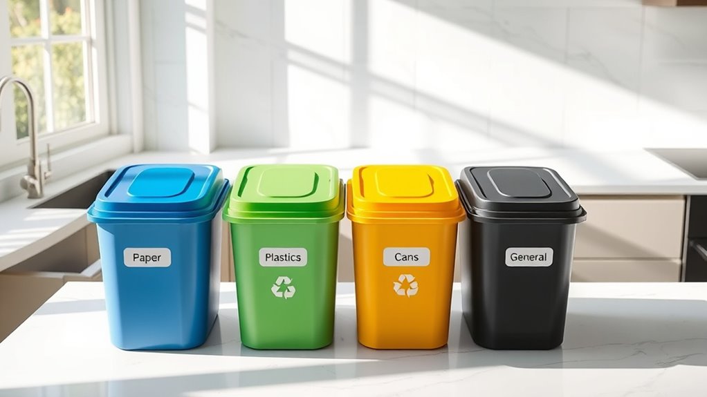 Choosing the right recycling bin is like planting a sturdy tree—each one supports your eco-friendly efforts. With options ranging from compact bins to large, dual-compartment models, you can find a perfect fit for your kitchen’s flow. Think of these bins as your environmental toolbox—simple, effective, and ready to help you reduce waste effortlessly. Pick the one that suits your space and habits, and watch your sustainability grow like a thriving forest.