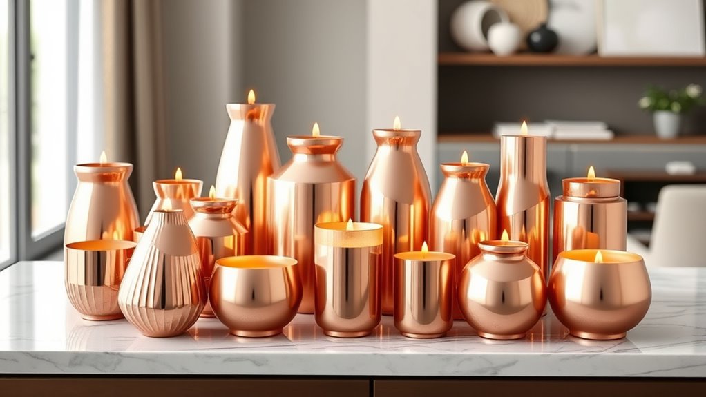 If you want to elevate your home decor, I suggest exploring a variety of rose-gold metal candle vessels that combine style and functionality. Options like the CONNOO set, SUPMIND’s large packs, and AOSWELE’s sleek matte tins provide elegance, durability, and versatility for DIY projects and gifting. These vessels come in different sizes and finishes, perfect for creating a luxurious ambiance. Keep going, and I’ll share how to choose the best ones for your space.